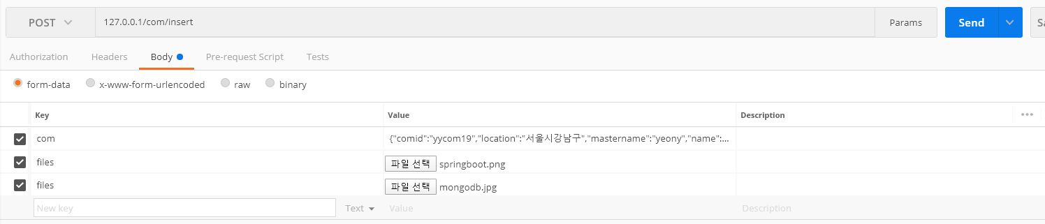 json은 string com , file은 arrayList<MultipartFile> files 로 requestParam으로 보냈다.